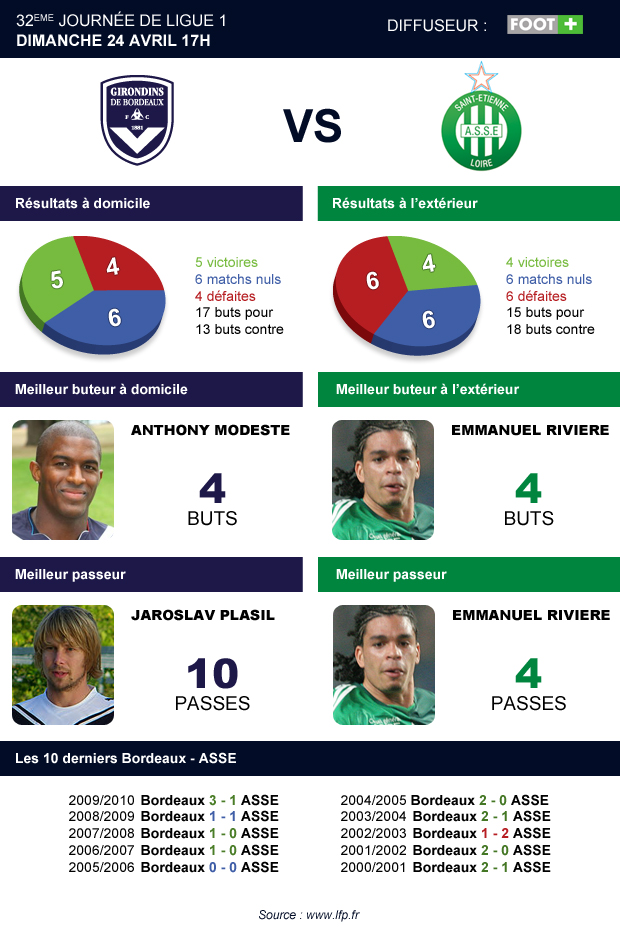 Historiquement, les Verts réussissent plutôt bien aux Girondins. En tous cas, si on en croit les résultats des 10 derniers matchs au stade Chaban Delmas, les bordelais sortent largement vainqueurs avec sept victoires, 2 matchs nuls et seulement 1 défaite. Seulement, peut-on s’appuyer sur les statistiques de ces dernières saisons tant les choses ont changé pour les aquitains depuis 1 an et demi ? On aimerait en tout cas voir les troupes de Jean Tigana jouer avec au moins autant d’abnégation que le weekend dernier face à Lille. Ils pourront en tout cas s’appuyer sur leur rampe de lancement, Jaroslav Plasil, actuel second au classement des meilleurs passeurs de Ligue 1.