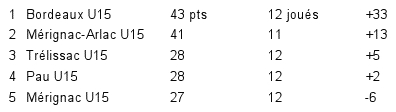Les U15 se sont imposés assez facilement face à Pau (4-1) ce qui leur permet de dépasser Mérignac-Arlac à quelques journées de la fin. Cependant ces derniers avec un match en moins ont les cartes en main pour reprendre leur position.