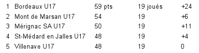 Les moins de 17 régionaux ont eux été tenus en échec par Mérignac-Arlac (2-2). Ils restent aux avant postes devant Mont de Marsan et Mérignac.