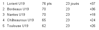 Les moins de 19 sont défaits à domicile par les berrichons de Châteauroux mettant fin à une série de 4 matchs sans défaite. Leur rêve de titre s’éloigne puisqu’ils sont désormais relégués à 6 points du leader Lorient.