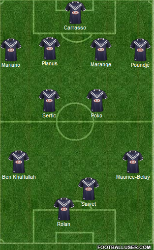 Bordeaux : Carrasso © – Marange, Planus, Poundjé, Mariano – Sertic (Plasil, 76ème), Poko, Ben Khalfallah, Maurice-Belay (Diabaté, 46ème) – Saivet, Rolan (Obraniak, 46ème).