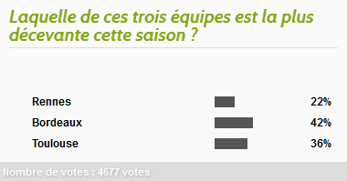 L’Equipe a d’ailleurs effectué un petit sondage aujourd’hui sur son site. “Laquelle de ces trois équipes est la plus décevante cette saison ?”. Parmi les choix possibles : Rennes, Toulouse, et… Bordeaux ! A l’heure où nous écrivons cet article (12h), Bordeaux est en tête sur plus de 4600 votes avec 42% des votes en sa faveur. (http://www.lequipe.fr/Football/Actualites/Sont-ils-hors-jeu/357146)