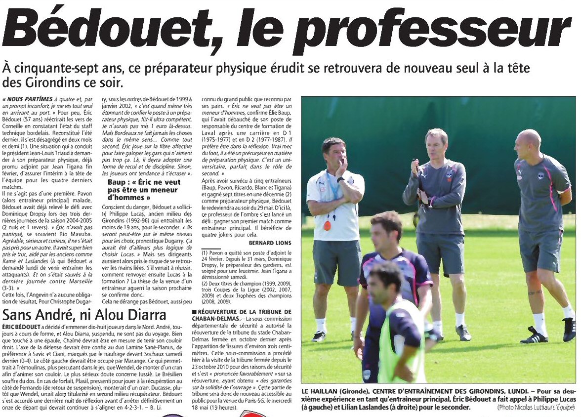 Nicox33 11/05 - 14h45 Bedouet, cet érudit du foot Zoom sur le nouvel entraineur bordelais, Eric Bedouet, dans l’Equipe du jour. Entretien avec d’anciens bordelais et une question : pourquoi ce n’est pas Lucas le N°1 et Bedouet le N°2 ?