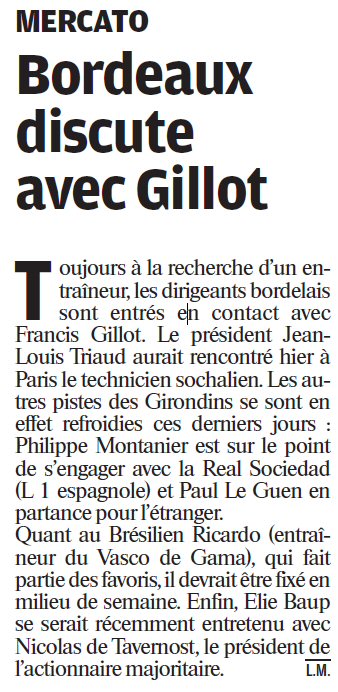 D’après le quotidien, les pistes menant à Philippe Montanier et Paul Le Guen sont sur le point d’échouer. Ricardo donne sa réponse mercredi. Pendant ce temps, Jean-Louis Triaud aurait rencontré hier Francis Gillot, le coach de Sochaux. Nicolas de Tavernost aurait quant à lui rencontré Elie Baup, une piste surprenante quand on se rappelle les conditions de son départ en 2003.