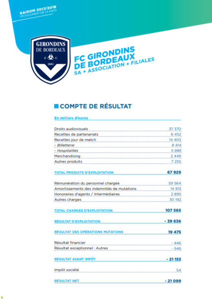 Les résultats financiers de l’exercice 2017-2018 des Girondins de Bordeaux