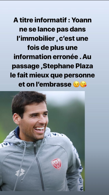 Il y a quelques jours, nous apprenions que l’ancien milieu de terrain des Girondins de Bordeaux, Yoann Gourcuff, se dirigeait, après sa retraite sportive, vers une carrière d’agent immobilier. Son épouse, Karine Ferri, a tenu à démentir cette information sur les réseaux sociaux. “A titre informatif, Yoann ne se lance pas dans l’immobilier, c’est une fois de plus une information erronée. Au passage, Stéphane Plaza le fait mieux que personne et on l’embrasse”.