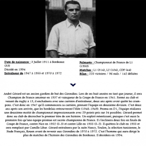 • André Gérard 03/07/1911-26/05/1994, gardien, au club entre 1936 et 1943, 129 matchs et 223 buts encaissés puis coach entre 1943 et 1957 puis 1970 et 1972, 483 matchs