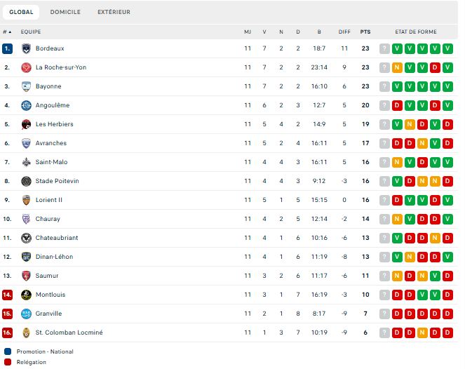Après onze rencontres de championnat, les Marine et Blanc comptent donc sept victoires, deux matchs nuls, deux défaites. Ils ont inscrit 18 buts et en ont encaissé 7. Ils passent à vingt-trois points au classement et sont leader du championnat. Ils devancent La Roche et Bayonne, qui ont également 23 points.