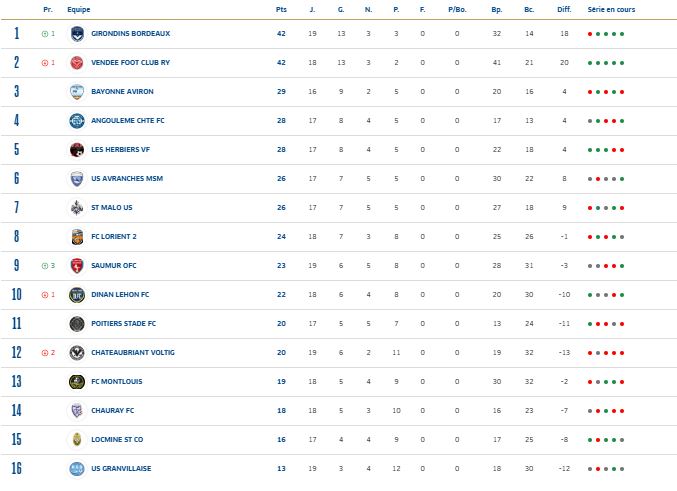 Après dix-neuf rencontres de championnat, les Marine et Blanc comptent donc treize victoires, trois matchs nuls, trois défaites. Ils ont inscrit 32 buts et en ont encaissé 14. Ils passent à quarante-deux points au classement et sont revenus sur La Roche, qui a un match en moins. En revanche Bayonne et Angoulême sont relégués à respectivement 13 et 14 points des bordelais, avec trois matchs en moins pour les basques, deux pour les charentais.