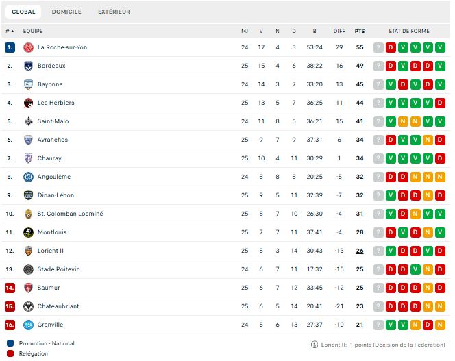 Après vingt-cinq rencontres de championnat, les Marine et Blanc comptent donc quinze victoires, quatre matchs nuls, six défaites. Ils ont inscrit 38 buts et en ont encaissé 22. Ils restent à quarante-neuf points au classement et laissent l’occasion au club de La Roche de prendre le large dimanche en cas de performance à Saint-Malo. En revanche Bayonne peut revenir à un point en cas de victoire.