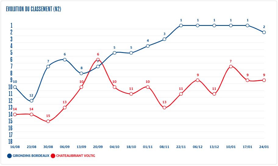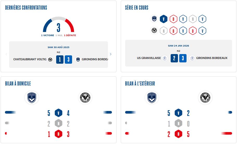 Les Girondins de Bordeaux ont croisé l’équipe de Châteaubriant à trois reprises, pour une victoire, un nul et une défaite, 6 buts marqués et 5 buts encaissés. Lors du match aller à l’extérieur, les bordelais s’étaient imposés 3 buts à 1. Royce Openda, Matthieu Villette et Ludéric Etonde ot été les buteurs, contre une réalisation d’Alexandre Leroyer, parti au mercato hivernal.