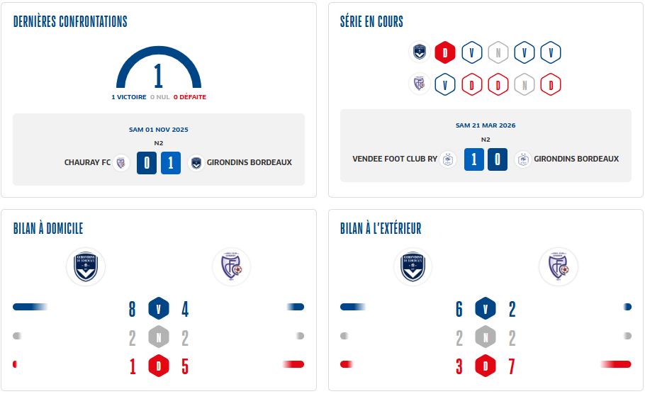 Les Girondins de Bordeaux ont croisé à une seule reprise le club de Chauray, c’était lors du match aller. Les Girondins s’étaient imposés un but à zéro grâce à Steve Shamal à la 9ème minute. La moyenne d’âge est de 26,4 ans à Chauray, contre 26,9 ans à Bordeaux.