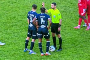 Nouveau duel dans cette première période mais Openda est mis au sol, coup-franc côté droit. El Hajjam cherche une tête mais c’est repoussé. Sur le contre, Driss Trichard stoppe irrégulièrement Araujo et prend un jaune. Ca s’échauffe entre joueurs, Araujo se relève et met Openda au sol, qui venait de lui dire de se relever, et l’arbitre sort un carton rouge ! La Roche terminera la rencontre à 10 (36ème 0-0). Le coup-franc est tout de même pour les locaux, c’est décalé côté droit mais le centre est trop long et terminer en touche à l’opposé. Nouveau tacle non maîtrisé, cette fois par N’Sikulu sur El Hajjam, carton jaune. Occasion bordelaise à la 45ème avec cette frappe d’Etonde mais c’est à côté. Sur la possession suivante, La Roche obtient un corner. C’est repoussé puis dégagé par Bordeaux.