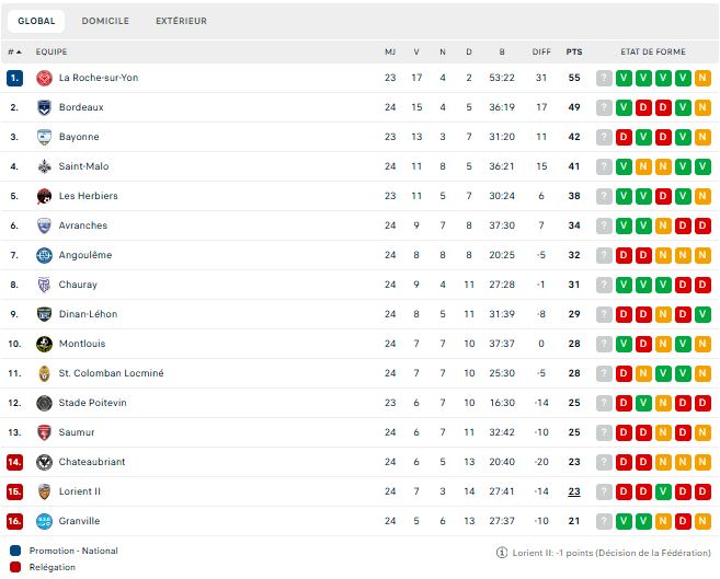 Pour l’ Aviron Bayonnais (3ème), l’objectif était de revenir sur Bordeaux et donc de s’imposer à Montlouis (11ème). Ils vont ouvrir le score par Ismail Cissé (0-1). Mais Montlouis va inverser la tendance en seconde période avec des buts de Youssef Hidasse et Geoffrey Marie-Louise pour porter le score à 2-1. Les bayonnais s’inclinent à quelques jours de recevoir La Roche en match en retard.