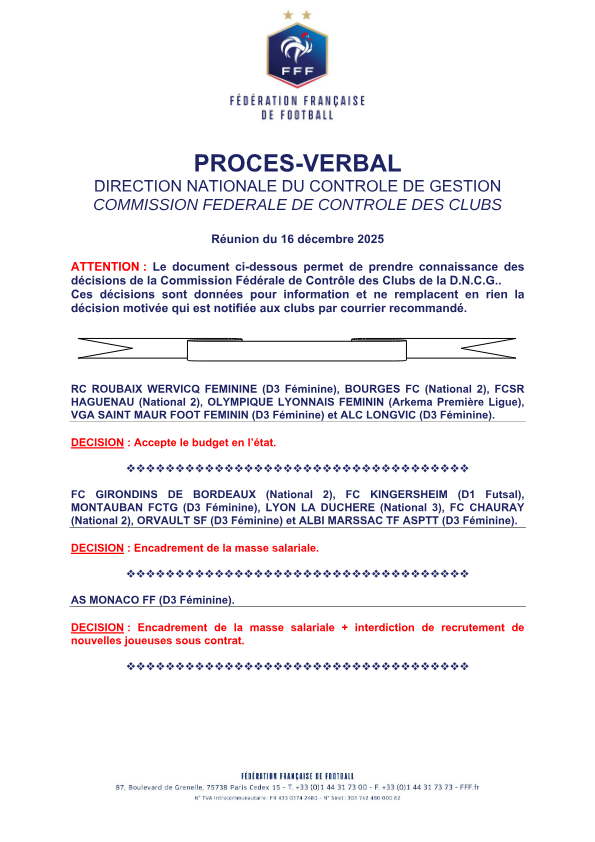 Ci-dessous, voici le communiqué publié par la Fédération Française de football sur les clubs passés ce jour devant la commission.
