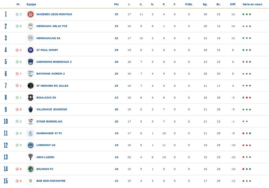- FC Girondins de Bordeaux 2 24pts +30 (-1m)