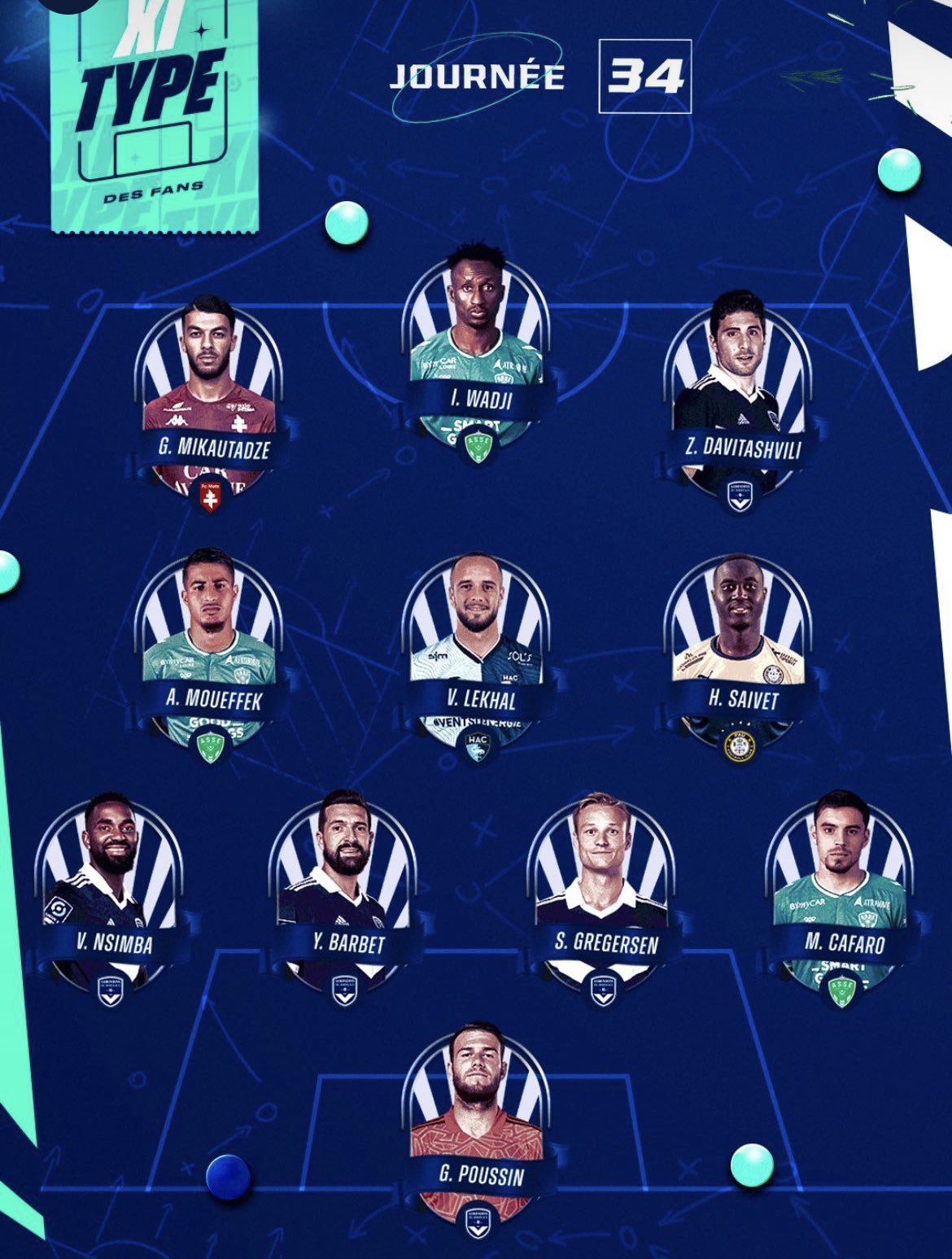 Cinq joueurs des Girondins de Bordeaux sont dans l’équipe type de la 34ème journée de Ligue 2, élue par les Fans présents sur le site de la Ligue : Gaëtan Poussin, Vital Nsimba, Yoann Barbet, Stian Gregersen, et Zuriko Davitashvili.
