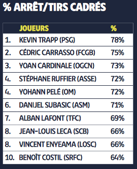 Nous le retrouvons également dans le classement des gardiens qui ont effectué le plus d’arrêts sur les tirs cadrés. Il se classe à la seconde place avec 75% des tirs cadrés arrêtés cette saison. Une belle performance donc pour lui. Il devance Yoann Cardinale de Nice et est devancé par le gardien du Paris-Saint-Germain Kevin Trapp.