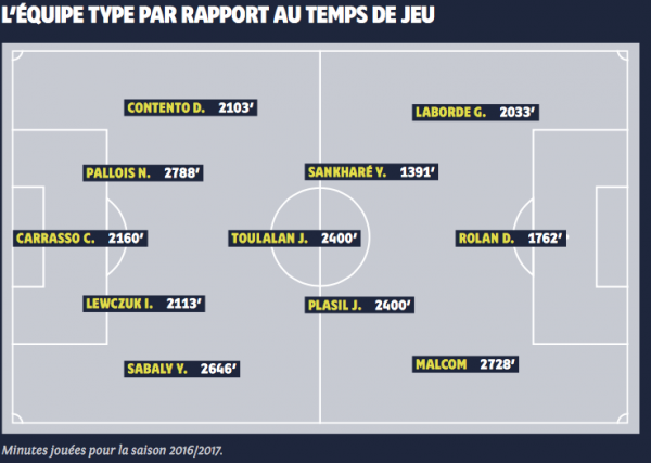 Dans les stats de fin de saison de la LFP figure l’équipe-type des joueurs suivant leur temps de jeu en Ligue 1. Le joueur qui a joué le moins dans cette équipe est Younousse Sankharé, seuls Jérémy Toulalan et Jaroslav Plasil ont plus joué au milieu que lui. Une équipe sans grande surprise qui correspond quasiment au onze type aligné par Jocelyn Gourvennec cette saison.