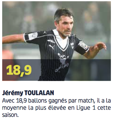 Parmi cette équipe, trois joueurs se sont distingués cette saison. Tout d’abord Jérémy Toulalan au milieu qui avec 18,9 ballons gagnés par match est le joueur qui a gagné en moyenne le plus de ballons sur la saison en Ligue 1.
