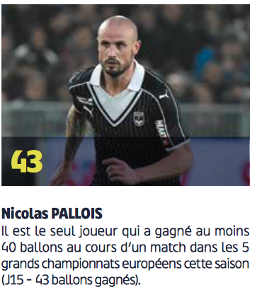 Enfin Nicolas Pallois lui aussi s’est distingué sur un match en particulier, c’était lors de la 15ème journée face à Bastia (1-1). Avec 43 ballons gagnés sur ce match, il est le joueur qui a gagné plus de 40 ballons sur les 5 grands championnats européens. Une belle performance.