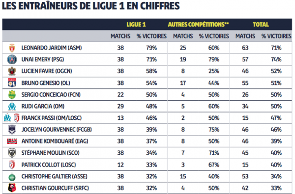 Après la première saison de Jocelyn Gourvennec à la tête des Girondins, on peut grâce aux stats de la LFP qui a fait le pourcentage de victoires en Ligue 1, sur les autres compétitions et sur l’ensemble des matches disputés cette saison par les Girondins avec à le technicien breton aux commandes. On peut voir qu’avec 38 matches de championnat, il compte 39% de victoires. Alors que sur les 8 autres matches des autres compétitions (coupe de France, coupe de la Ligue) il a rapporté 75% de victoires. Au total de la saison, l’entraineur bordelais compte 46% de victoires sur le 46 matches joués.