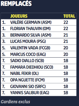 Ensuite on peut voir une des décisions de l’entraineur bordelais impacter le milieu bordelais Valentin Vada qui se retrouve parmi les joueurs de Ligue 1 les plus remplacés cette saison. Le jeune milieu bordelais a dû céder sa place à 20 reprises lors de la saison. Il se retrouve être le 5ème joueur de Ligue 1 le plus remplacé. Remplacé ne veut pas dire être mauvais, on le voit avec les joueurs qui sont classés devant le petit argentin, Valère Germain, Florian Thauvin sont en tête suivi de Bernardo Silva et Lucas Moura.