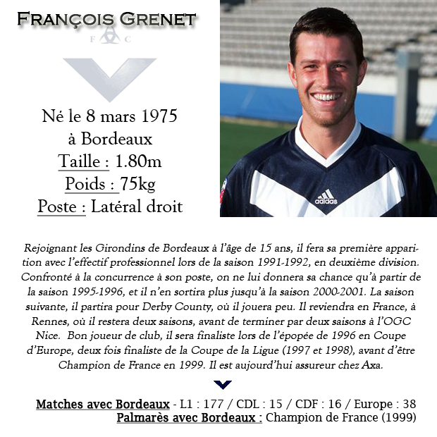 France Football a réalisé un portrait de François Grenet et nous donne par la même occasion des nouvelles de notre ancien latéral. Sa reconversion ? Il est actuellement assureur à Lormont. « Mon cheminement a fait que j’ai commencé ma vie professionnelle par le dessert. J’ai connu tellement de belles choses en début de carrière : une finale de Coupe d’Europe à 21 ans (UEFA 1996), un titre en 1999. La trentaine approchant, j’ai senti la flamme diminuer. Donc je me suis dit qu’il fallait fortement anticiper la suite. C’est un métier où l’on se sent vivant. J’avais la tête sur les épaules, une éducation normale, une enfance heureuse, sur le papier tout était réuni pour que ma reconversion se passe en douceur. En fait, ça a été violent quand ça s’est arrêté… Waouh ! Quand tu es footballeur, tu es coupé de la réalité, assisté, dans une vie parallèle. Je n’ai pas voulu rester dans le milieu du foot mais être autonome, dans la vraie vie, avec un métier normal. J’ai eu la chance de m’épanouir. Une fois que c’est parti, c’est bon. Je n’ose pas imaginer ceux qui n’ont pas anticipé et qui ne roulent pas sur l’or. Il doit y avoir des gars au fond du trou. Le fait de savoir ce que je voulais, ç’a a forcément aidé. Mais ça n’a pas été facile, tu te remets à nu ».