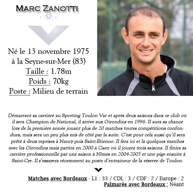 Passé par les Girondins de Bordeaux, Marc Zanotti devient adjoint de Momo Sadani au Sporting Toulon Var, club qui vient de monter en CFA2 en terminant 1er de Division d’Honneur en 2013-2014. L’ancien bordelais possède le DEF qui lui permet d’avoir les compétences à ce poste. Son entraineur principal a d’ailleurs évoqué son arrivé sur le site officiel du STV : « Il est très compétent et connait bien le club. Son expertise et sa présence sur le banc et aux entrainements sont des atouts majeurs pour attaquer cette saison en CFA 2 ».