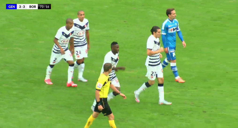 Malheureusement, Bordeaux va encaisser un second but rapidement (47ème), Cédric Yambéré étant trop court, tout comme Jérôme Prior. Bordeaux réagit par l’intermédiaire de Cheick Diabaté qui marque d’un bel extérieur du pied sur un coup franc de Greg Sertic. Mais l’arbitre siffle un hors-jeu difficilement vérifiable à la vidéo. Le géant malien fut remplacé à l’heure de jeu par Emiliano Sala. Wahbi Khazri fit sa première entrée dans le même temps, tout comme Abdou Traoré, donnant cette composition :