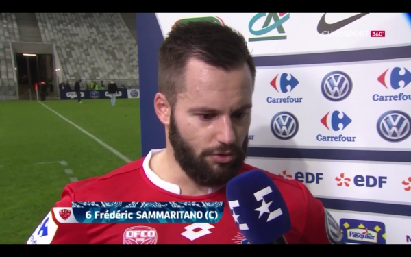 Le dijonnais Frédéric Sammaritano s’est exprimé sur cette première période qui voit son équipe regagner les vestiaires avec un score nul et vierge. “Ce n’est pas mission accomplie. On va dire que l’on est venu avec des intentions. Pour le moment, nous sommes toujours sur un score vierge mais il s’en est fallu de peu. Défensivement on est à peu près correct mais dans la maitrise du ballon et techniquement c’est assez pauvre pour le moment. Il va falloir changer certaines choses avoir plus de mouvements et plus de qualité technique si l’on veut marquer un but […] On ne va pas faire de complexe d’infériorité. On est venu pour se qualifier même avec des joueurs qui manquent un peu de temps de jeu, on va tout donner ensemble pour aller chercher la qualification”.