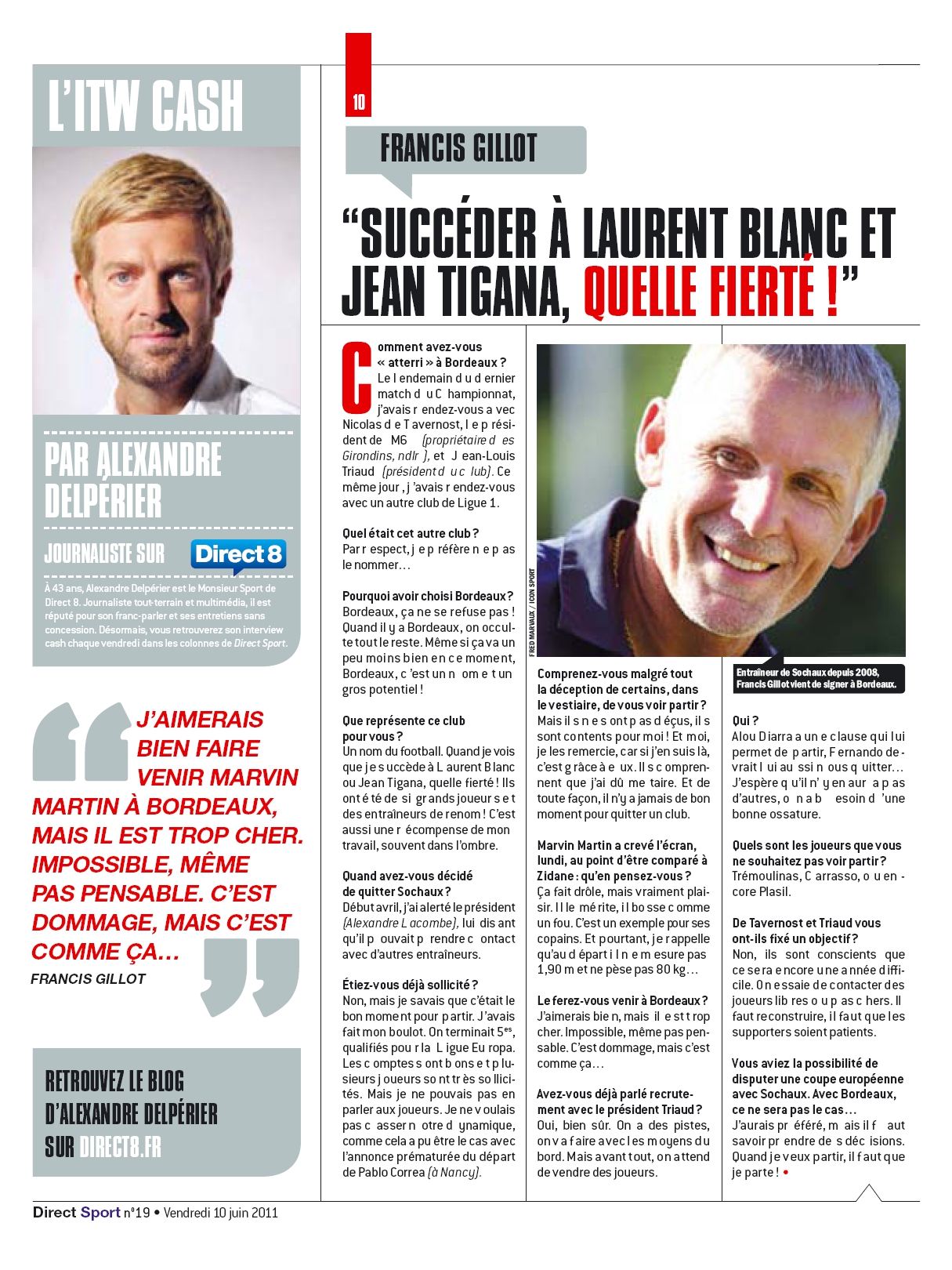 Interrogé par Direct Sport, le nouvel entraîneur bordelais Francis Gillot revient sur le choix de rejoindre les Girondins de Bordeaux. Il évoque également le mercato qui s’est ouvert ce mardi, et balaye notamment la possibilité de transfert de son ancien protégé, Marvin Martin. Il confirme également les probables départs d’Alou Diarra et Fernando, mais souhaite conserver les autres joueurs, et plus particulièrement Cédric Carrasso, Jaroslav Plasil et … Benoit Tremoulinas.