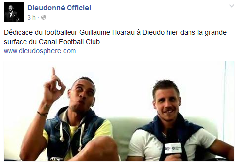 Dans le CFC hier, Guillaume Hoarau a fait un signe – vocal et gestuel – qui s’apparente à un geste utilisé par Dieudonné dans ses spectacles et ses ‘allocutions’ sur le web. Personne ne sait s’il s’agit d’un signe volontaire de l’ex attaquant des Girondins, rendant “hommage” à l’humoriste, ou s’il s’agit d’une mimique. Quoi qu’il en soit, Dieudonné, via son compte Facebook, se sent particulièrement concerné, y voyant une “dédicace”.