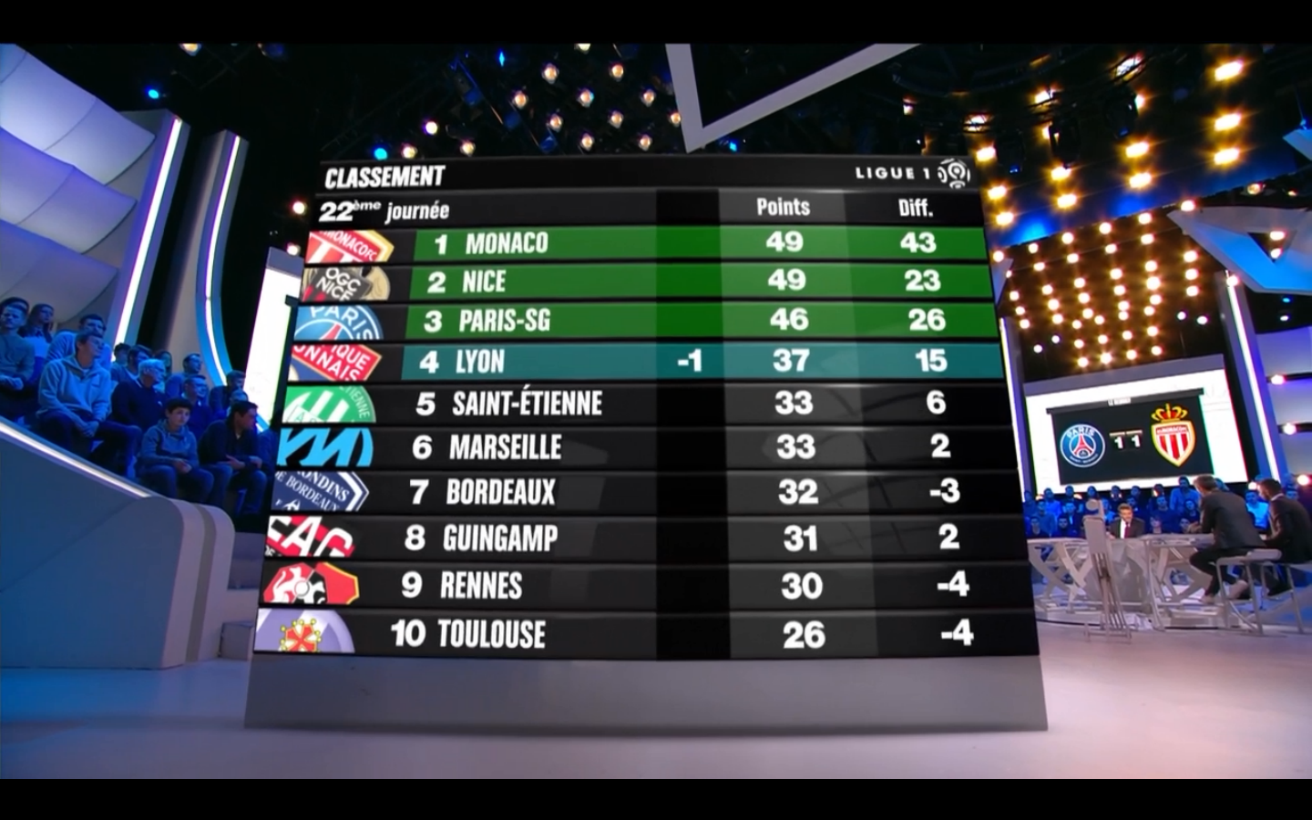 La 22ème journée s’est terminée par le match nul entre le PSG et Monaco (1-1). 6ème hier soir, Bordeaux est redescendu d’une place à cause de la victoire de Saint-Etienne sur Toulouse cet après-midi (3-0). Bordeaux est donc 7ème à 5 points de Lyon, 4ème et à seulement un point de Marseille, 5ème.