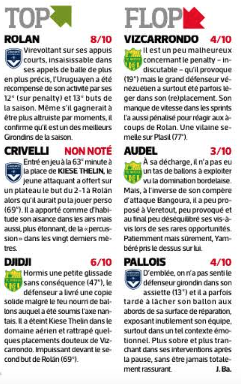 Héros du match pour cette dernière à Lescure avec son doublé, Diego Rolan hérite d’un mérité 8/10 dans les Top/Flop de l’Equipe pour ce Bordeaux-Nantes avec ce commentaire : “Virevoltant sur ses appuis courts, insaisissable dans ses appels de balle de plus en plus précis, l’Uruguayen a été récompensé de son activité par ses 12è (sur pénalty) et 13è buts de la saison. Même s’il gagnerait à être plus altruiste par moments, il confirme qu’il est un des meilleurs Girondins de la saison”.