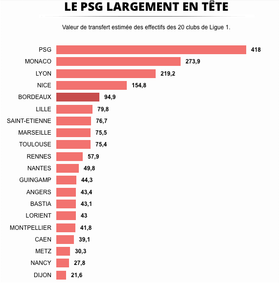 L’Equipe via l’observatoire du football CIES a dévoilé le classement de la valeur des effectifs de Ligue 1. Si le Paris-Saint-Germain est largement en tête avec un effectif estimé à 418 M€, suivent Monaco et Lyon avec respectivement 273,9 M€ et 219,2 M€. Les Girondins se positionnent à la 5ème place de ce classement avec une valeur d’effectif estimée à 94,9 M€.