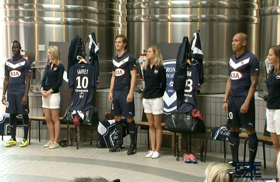 Le nouveau maillot domicile des Girondins de Bordeaux pour la saison 2014-2015 a été présenté officiellement il y a quelques minutes (en direct sur Girondins Tv). Nous découvrons un maillot bleu marine, avec un col boutonné et un gros scapulaire blanc souligné de rouge, ainsi que de très petites feuilles de vigne rouges sur l’ensemble du maillot.