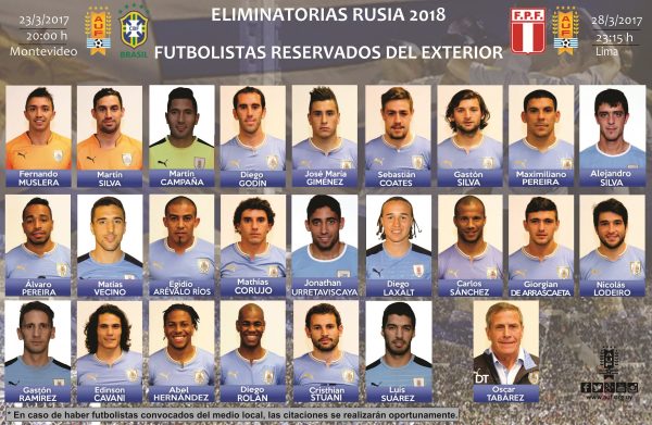Pour le compte des éliminatoires de la Coupe du Monde 2018 en Russie, la sélection uruguayenne a dévoilé sa liste de joueurs pour affronter le Brésil et le Pérou (respectivement le 23 et 28 mars). Le bordelais Diego Rolan figure donc dans cette liste, aux cotés notamment du parisien Edinson Cavani. Bonne chance à lui !