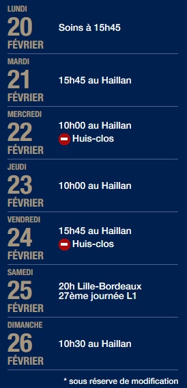Joe Joe 19/02 - 22h31 [S8] Le programme de la semaine au Haillan Le club a communiqué sur son site le programme des entraînements pour cette nouvelle semaine au Haillan. Les joueurs vont préparer le déplacement à Lille.