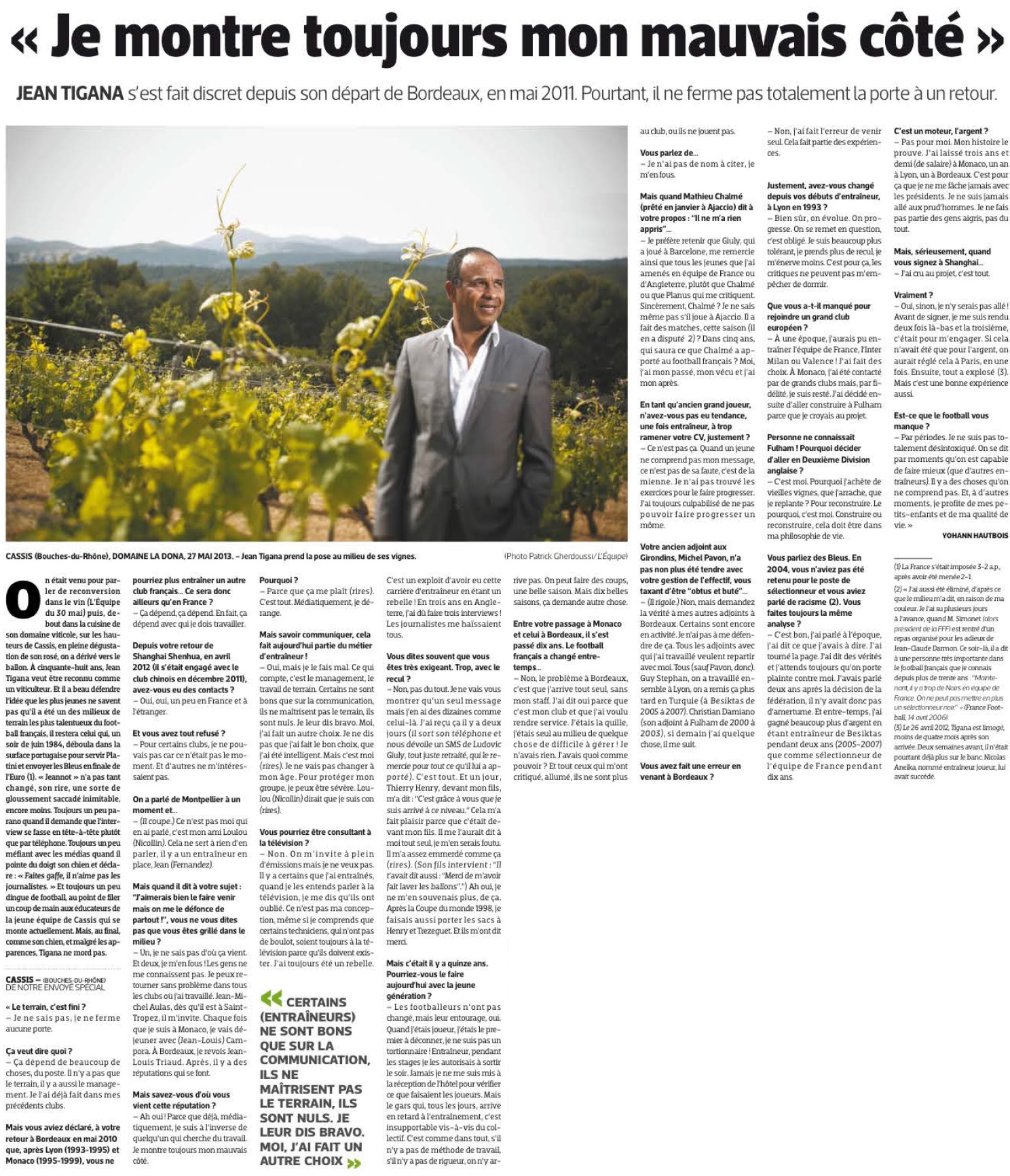 Quelques années après son départ houleux des Girondins, l’Equipe est allé à la rencontre de Jean Tigana. Il en profite pour régler ses comptes avec les personnes qui l’ont critiqué : Chalmé, Planus et Pavon en prennent pour leur grade.