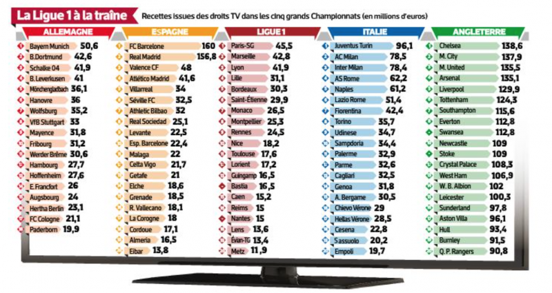 La France et sa Ligue 1 se plaignent régulièrement du manque d’argent pour concurrencer les autres cadors européens. L’Equipe présente la somme allouée à chacun des clubs des cinq grands championnats (Allemagne, Espagne, France, Italie et Angleterre). A ce petit jeu, Bordeaux est classé 58ème club européen le mieux doté avec 30,3 M€. Si l’Angleterre truste les premières places avec ses droits pharaoniques, de nombreux clubs allemands et italiens sont placés devant les Girondins.