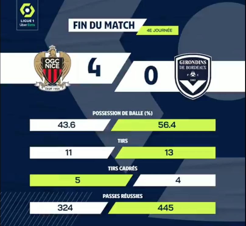 Mike Mike 28/08 - 19h30 Statistiques [J4] Les statistiques d’après Nice-Bordeaux (4-0) Voici les statistiques d’après la rencontre entre l’OGC Nice et les Girondins de Bordeaux (4-0).