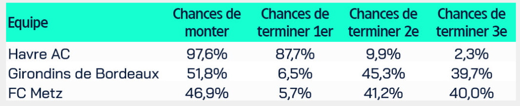 Bordeaux a 6.5% de chances de terminer premier, 45.3% deuxième, et 39.7% de chances de terminer troisième et donc de rester en Ligue 2. Pour le FC Metz, c’est 46.9% de chances de monter, 41.2% de chances de terminer deuxième, et 40% de chances de rester en Ligue 2 avec une 3ème place au classement final.